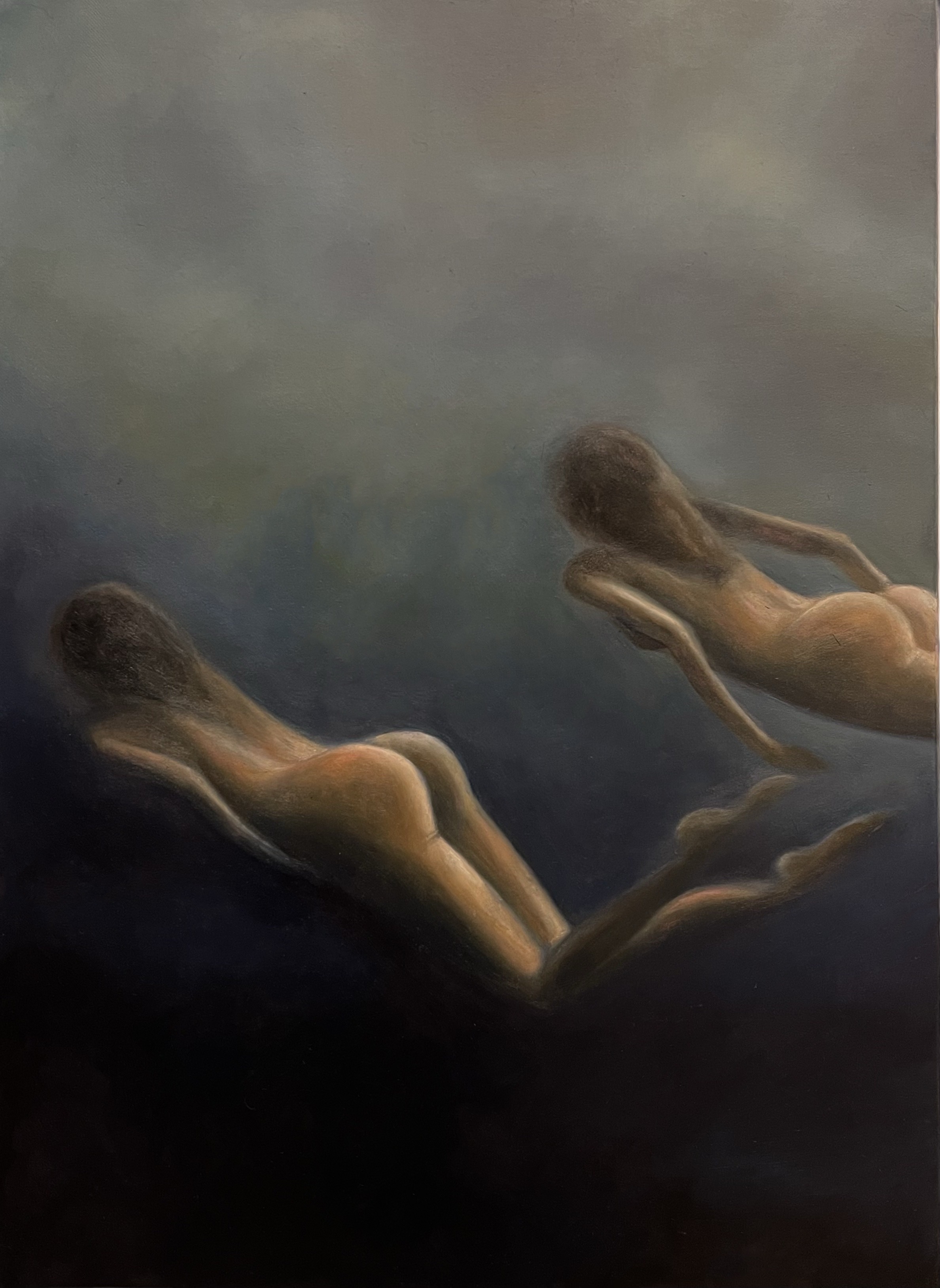 Renske Linders est de ces personnes dont la manière d'être au monde semble liquide. Née en 1995, l'artiste grandit à La Haye, aux Pays-Bas et retient de son enfance au bord de la mer un attachement au milieu aquatique dans lequel elle se représente, nageuse parmi d'autres, dans ses peintures. Celles-ci dévoilent des moments de vie, où l'intime se lit comme une histoire partagée d'amour, de quêtes, de renouveau et où la figure féminine occupe une place centrale. Renske se nourrit en effet de son expérience en tant que mannequin professionnel et n'a de cesse d’interroger l’idéalisation des corps inhérente à l'industrie de la mode, conduisant à une distorsion de la réalité. Elle trouve dans l'art et la peinture une échappatoire lui permettant de s'émanciper de ces dictats et se réapproprier le corps féminin, son corps à elle, leur corps à toutes.