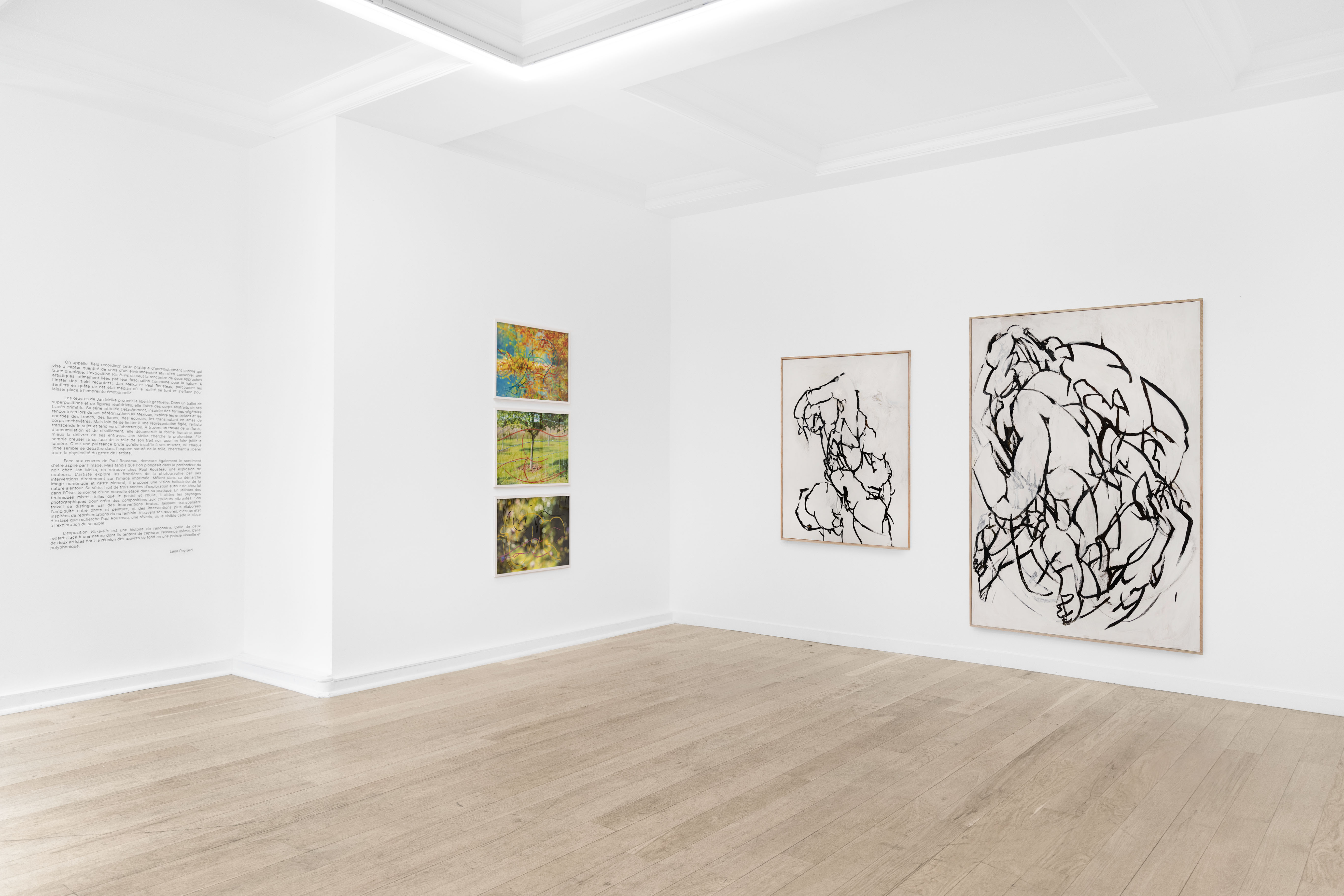 Les œuvres présentées dans l'exposition oscillent entre la grandeur des panoramas et l'intimité des esquisses. Alors que les grands formats de Jan Melka et Paul Rousteau se comportent comme des portails vers un univers parallèle propice à l'exploration de nos imaginaires, leurs petits formats, plus confidentiels, nous dévoilent le processus créatif à l'œuvre. Ces derniers agissent comme un laboratoire d'observation et célèbrent le geste spontané, l'inspiration déployée. Ainsi, l'exposition Vis-à-Vis est une histoire de rencontre. Celle de deux regards face à une nature dont ils tentent de capturer l'essence même. Celle de deux artistes dont la réunion des œuvres se fond en une poésie visuelle et polyphonique.